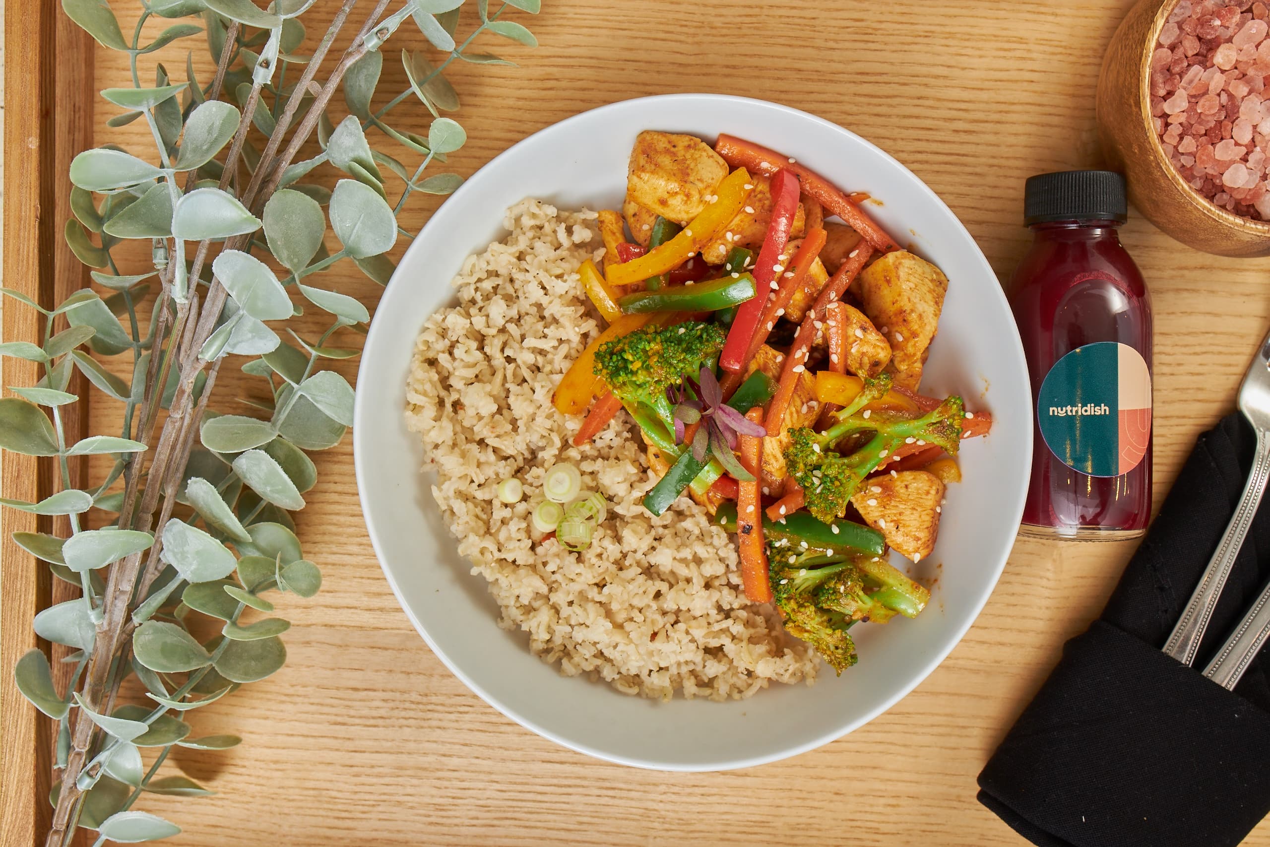 Tender chicken stir fry with veggies served with brown basmati rice.