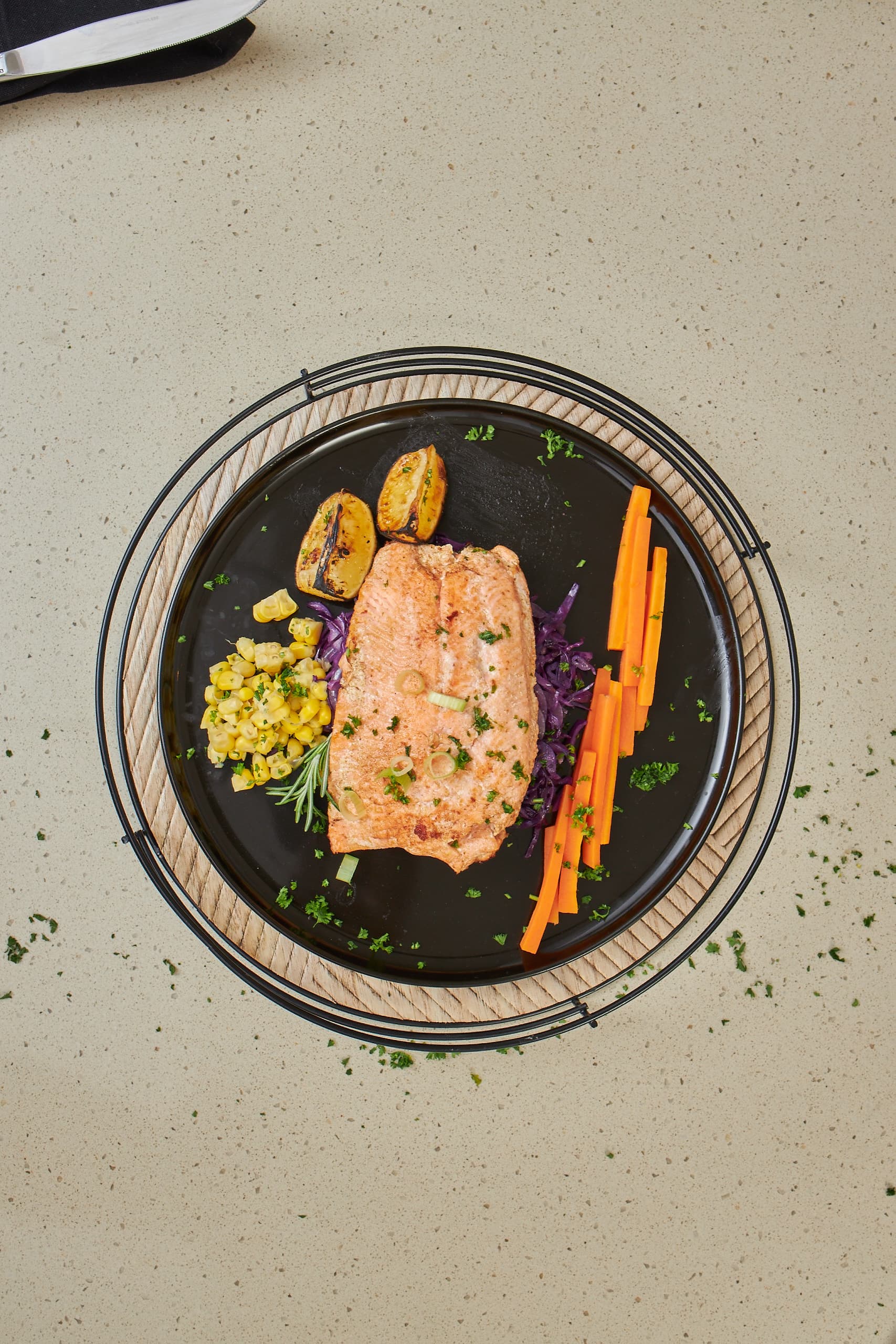 Garlic lemon butter trout with red cabbage, carrots and sweet corn slaw.